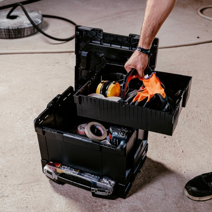 Die L-BOXX 238 steht für kompromisslose Stabilität. Aus schlag- und stoßfestem ABS-Kunststoff gefertigt, hält sie auch dann stand, wenn es auf der Baustelle mal etwas rauer zugeht. Das patentierte Klicksystem sorgt für eine sichere Verbindung im Verbund und macht aus mehreren L-BOXXen ein cleveres Transportsystem. Bis zu 25 kg trägt der stabile Werkzeugkoffer einzeln, im Klick-Verbund sogar bis zu 40 kg. Work.Clever Click.Together - das spart Dir Wege und eine Menge Nerven.