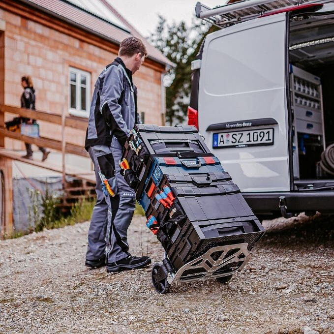 The foldable hand truck L-BOXX Caddy is made of sturdy aluminum – ideal for safely and comfortably transporting L-BOXX tool cases or bulky items in your daily work routine.