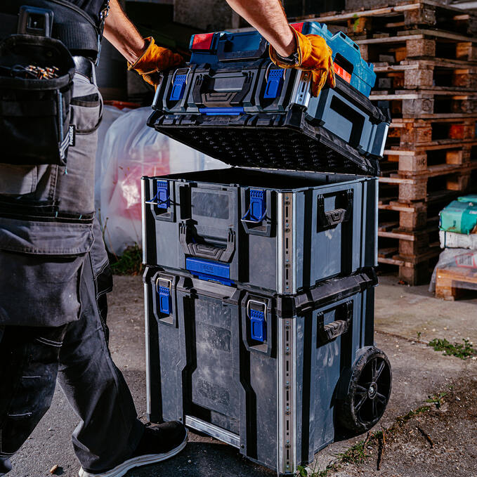 Du willst stapeln, koppeln, trennen? Kein Problem - per patentiertem Einhandmechanismus geht das ganz ohne Kraftaufwand. Und weil er voll kompatibel mit dem L-BOXX Contractor und dem ProClick System sowie der L-BOXX Baseline ist, wird aus einzelnen Modulen im Handumdrehen Dein perfektes Transport- und Aufbewahrungssystem. Aluminiumschienen zum Andocken von ProClick Werkzeugtaschen, M6-Gewinde zur Befestigung von weiterem Zubehör - und die mitgelieferten Trennstege sorgen für mehr Struktur im Innenraum. Hier steckt mehr drin, als man auf den ersten Blick sieht. Das wetterfeste Gehäuse nach IP65 schützt Dein Werkzeug zuverlässig - auch bei Wind und Wetter. Und nicht zu vergessen: Per Klickmechanismus stapelbar, dank Cubingkonzept zum stabilen Unterbau für eine mobile Arbeitsfläche erweiterbar - so entsteht vor Ort Struktur mit Mehrwert. Und wenn Sicherheit auch noch eine Rolle spielt - dann kannst Du dank Safety Lock Deinen Werkzeugkoffer einfach mit zwei optionalen Vorhängeschlössern absperren.